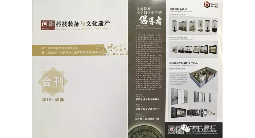 圖為博信展櫃文博設施全定製化生產的倡(chàng)導者觀(guān)點和博物館展櫃係(xì)列(liè)在(zài)《創新科技裝備與文化遺產》會刊封麵二專業展示